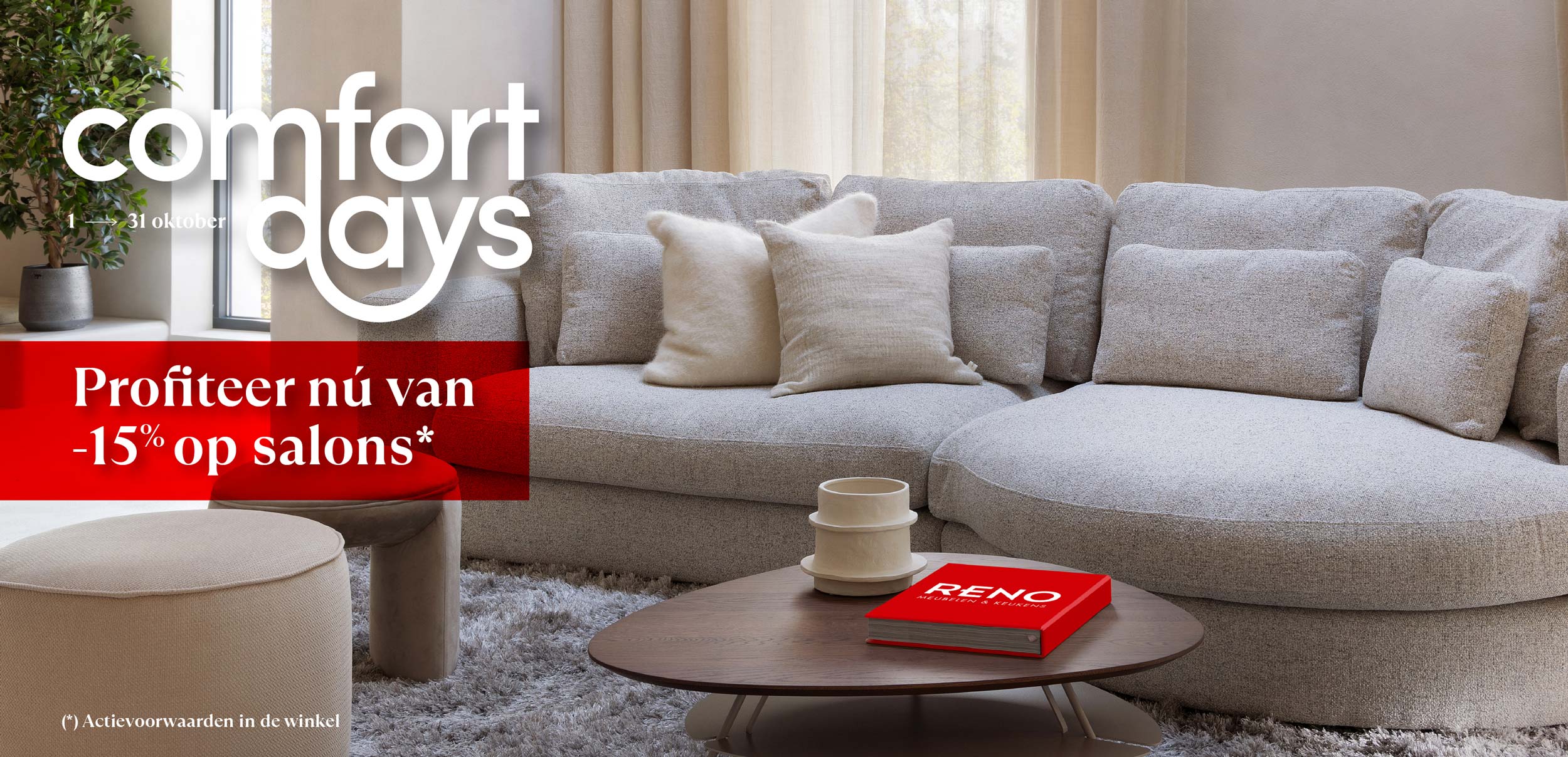 In oktober zit je bij Reno supergoed! De ganse maand geven wij immers 15% directe korting op jouw nieuw salon. Het enige wat jij hoeft te doen, is kiezen. Wij zorgen ondertussen voor de beste prijs!